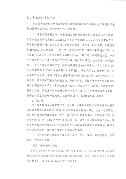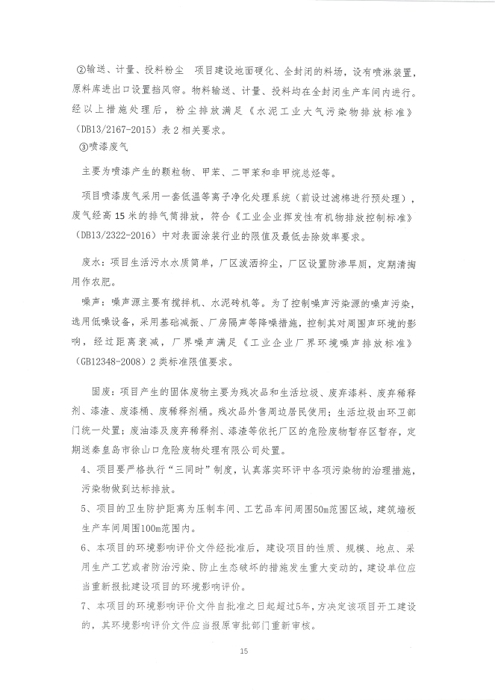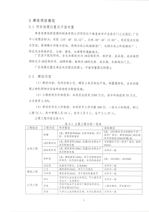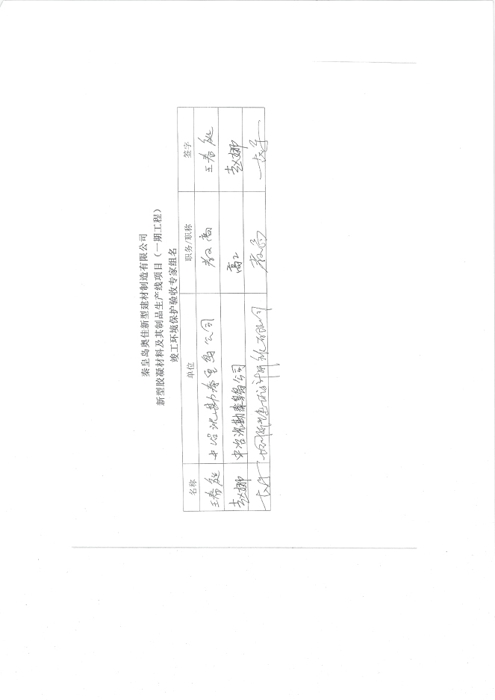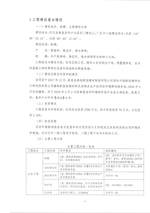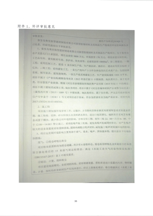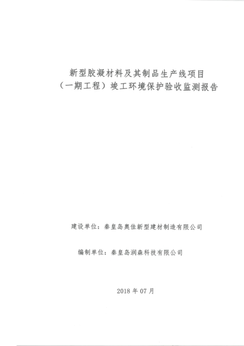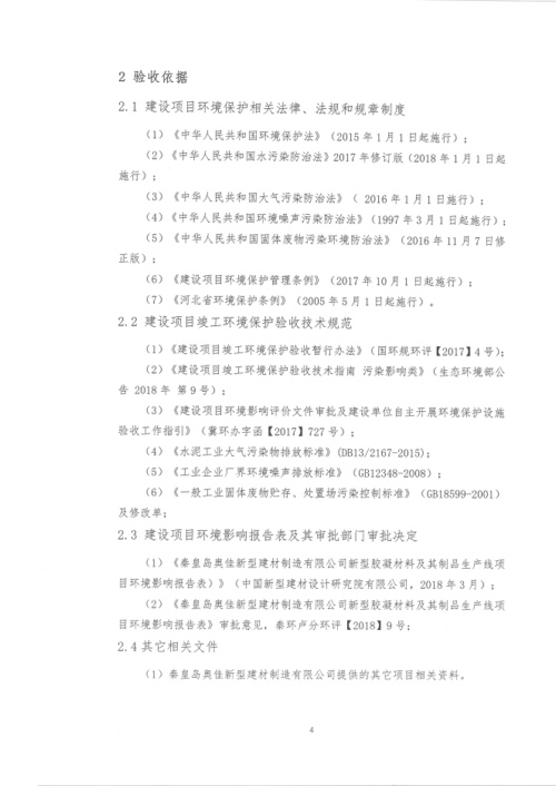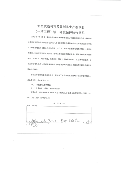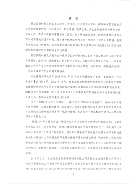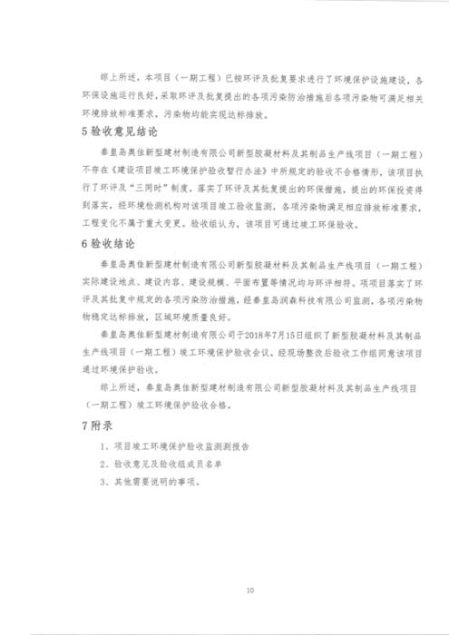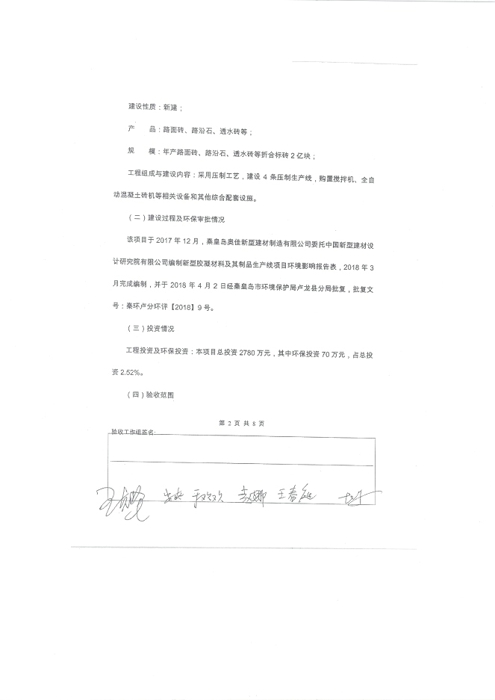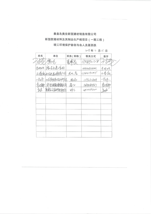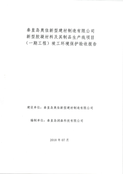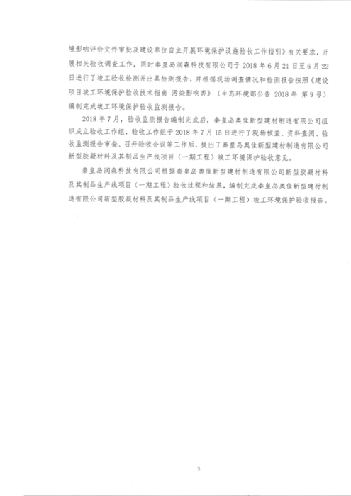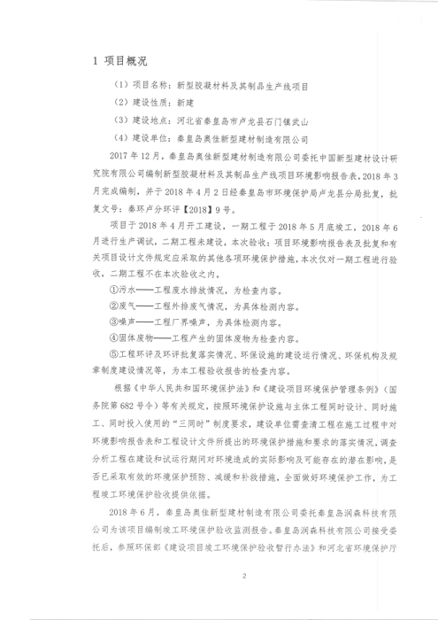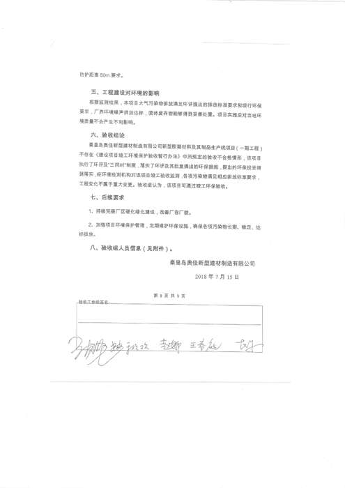 2018年7月15日,秦皇岛奥佳新型建材制造有限公司组成验收工作组,根据《建设项目竣工环境保护验收暂行办法》及《建设项目环境影响评价文件审批及建设单位自主开展环境保护设施验收工作指引(试行)》、建设项目竣工环境保护验收技术规范等要求,对本项目进行自主验收。验收工作组由项目建设单位、环境影响报告表编制单位、监测单位、设计单位、施工单位、验收报告编制单位及3名技术专家组成(验收工作组名单附后)。同时邀请秦皇岛市环境保护局卢龙县分局的代表对竣工环境保护验收进行指导。